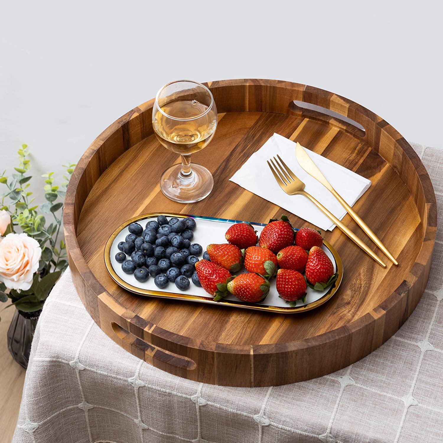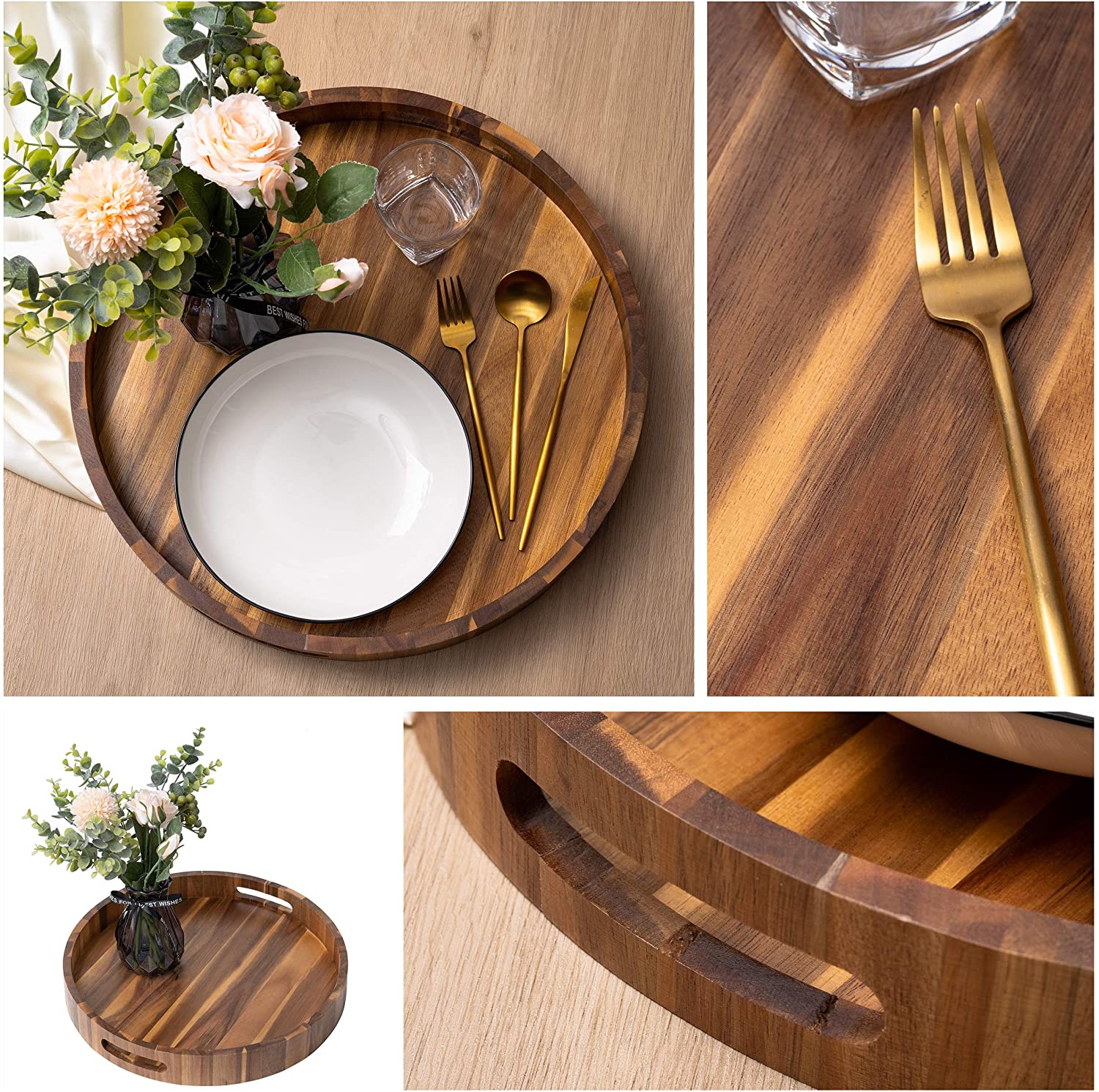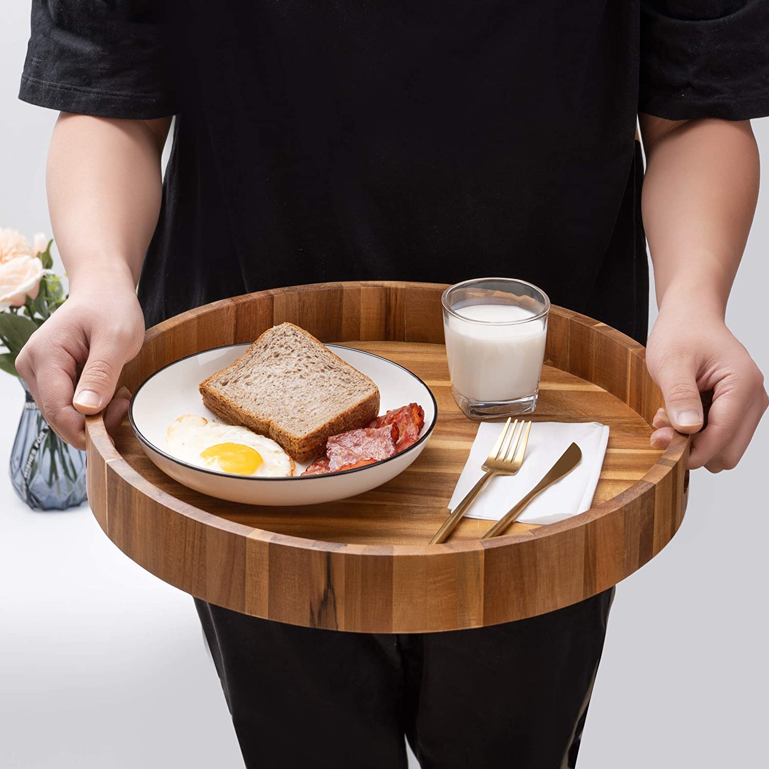 Round wooden trays with handles